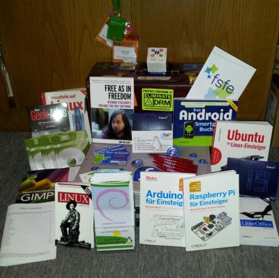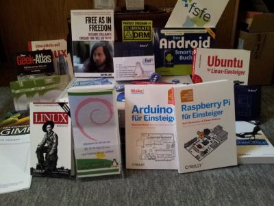 Auch die bereitgestellten Give-Aways hinterliessen bei den Leuten einen guten, manchmal verwunderten Eindruck. Jeder durfte sich eine Live-DVD der Linux-Distribution Fedora in der aktuellsten Version mitnehmen, um sich direkt mit eigener Hardware von allen Vorzügen Freier Software zu überzeugen. Besonderer Dank geht hierfür an das Fedora-Projekt, von denen die DVDs sowie Luftballons, Buttons und Sticker stammen. Auch auf eine neue Enthusiastin, welche Ubuntu seit einigen Tagen nutzt und sich vorher per Mail gemeldet hatte, war ich bestens vorbereitet. Dank eines umfangreichen "Care-Paketes" vom O'Reilly Verlag konnte ich Ihr ein Einsteigerbuch zu dieser Distribution überreichen.