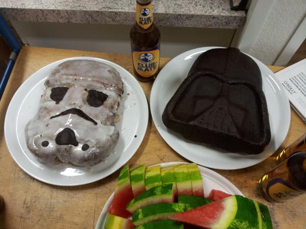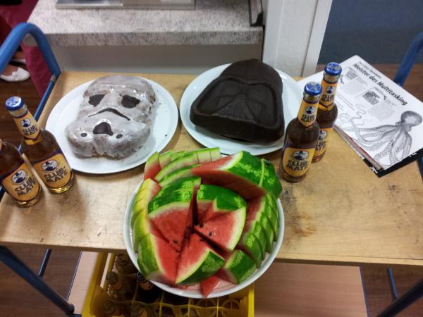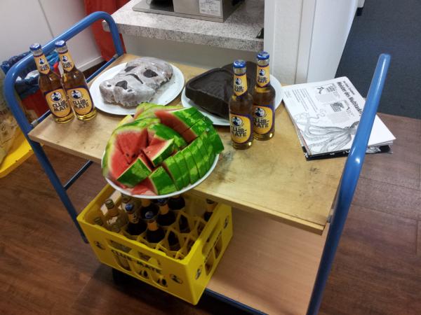 Schöner Kuchen, eine gekühlte Wassermelone (die seltsamerweise zuerst weg war...), Club Mate und ein paar schöne Poster des O'Reilly Verlages.