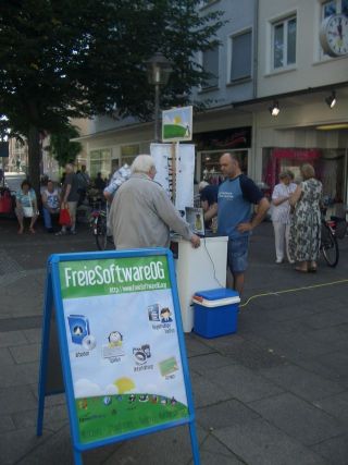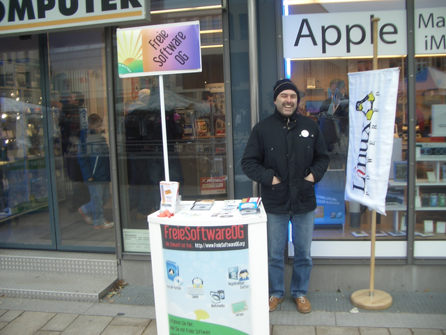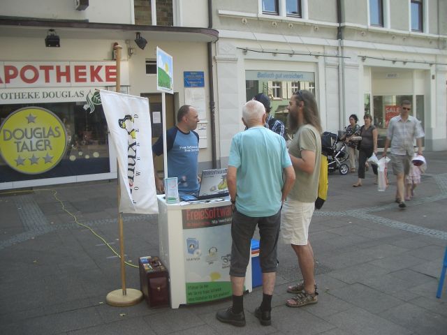 Es wurden Kunden und Passanten über die Vorzüge Freier Software informiert und Ubuntu bzw. openSuse CDs verteilt.